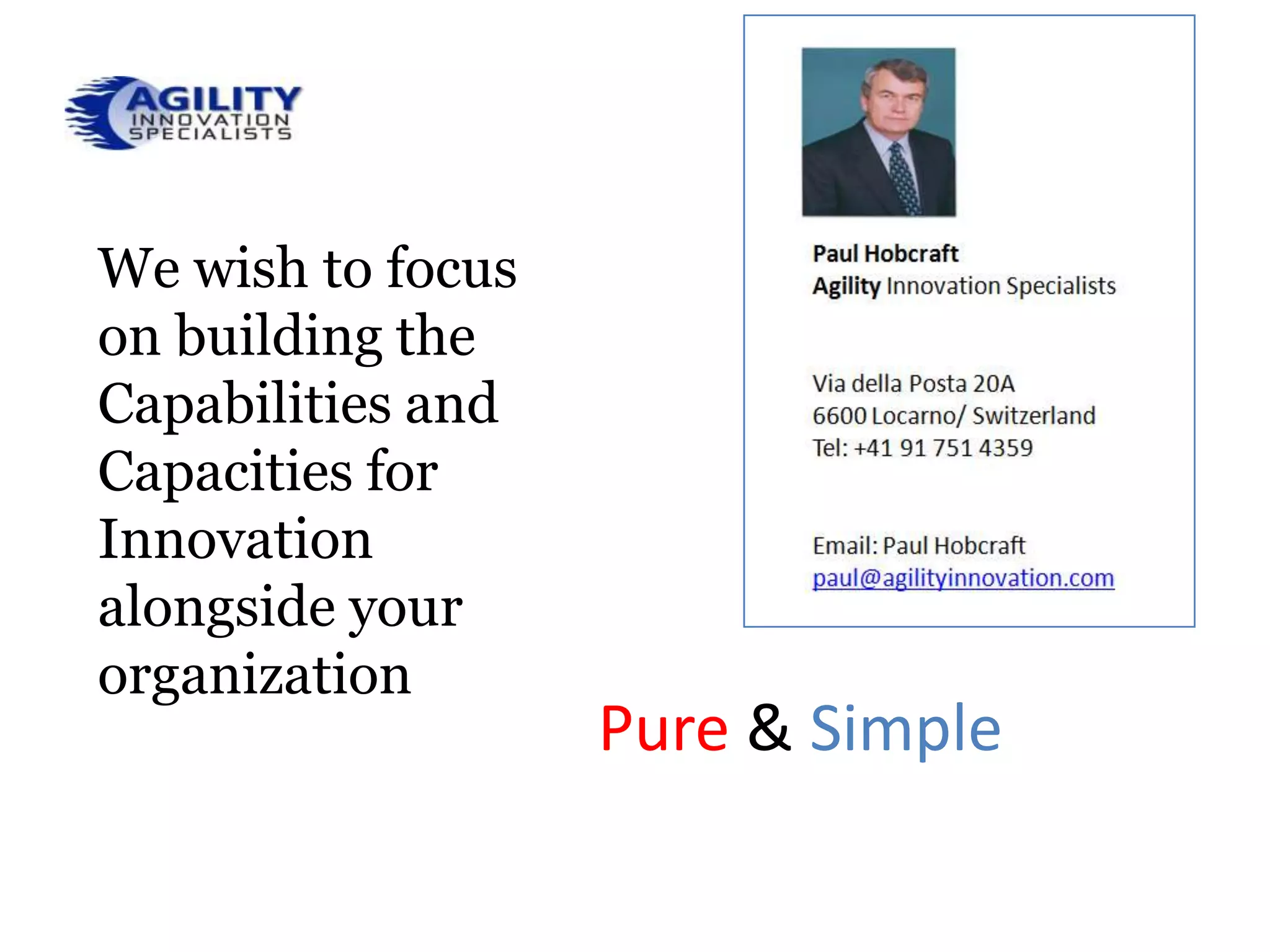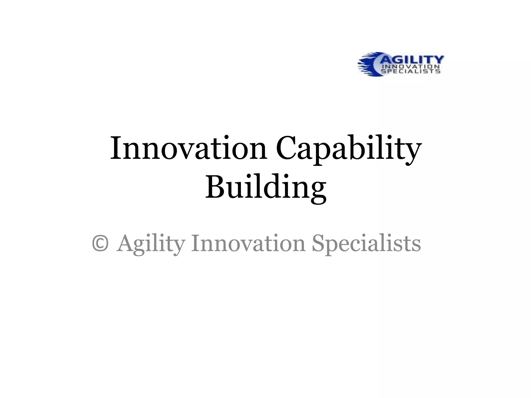 Agility Innovation Specialists aims to help organizations build capabilities and capacities for innovation. They focus on identifying business opportunities, developing expertise, and creating value for clients. Agility takes a structured approach, first seeking the client's perspective and challenges. They then work to structure a relationship and solution. Agility helps make the business case for innovation by quantifying value, identifying opportunities, and linking initiatives to outcomes and impact. Their goal is to improve innovation conditions and build greater synergies, capabilities, and capacities through tools, skills development, collaboration and leadership strategies.