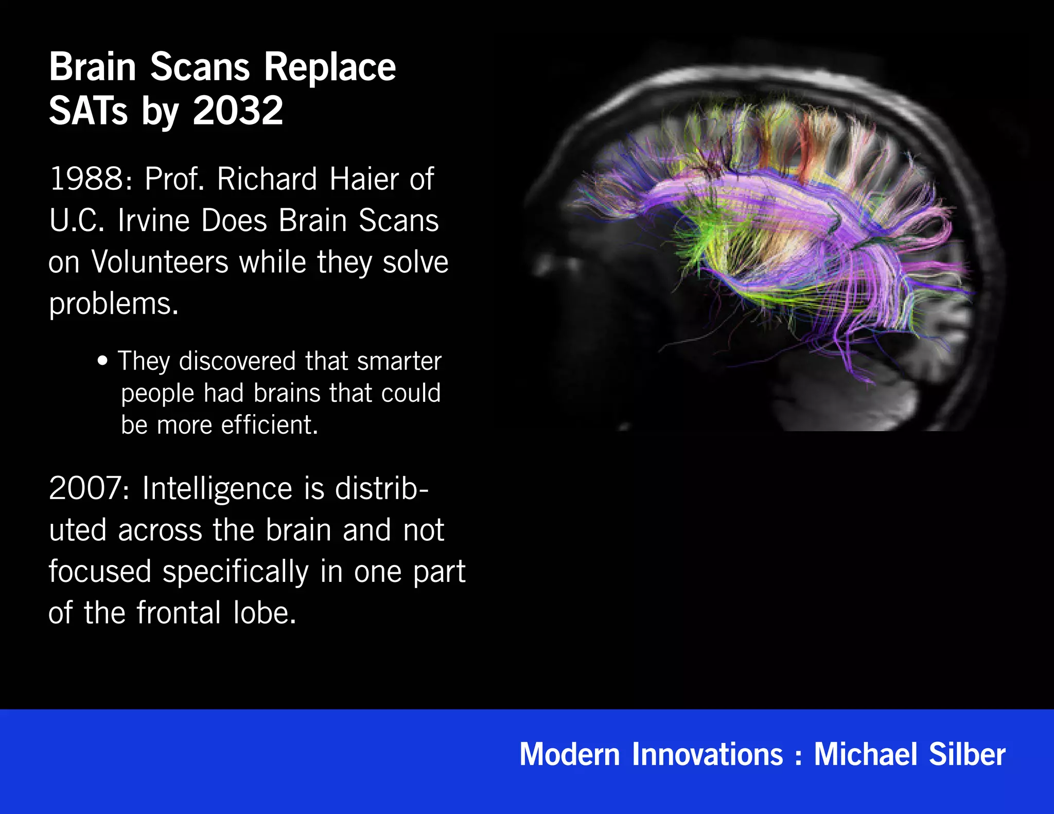 Brain scans may replace SATs by 2032 according to research done in 1988 and 2007. In 1988, brain scans of volunteers solving problems found smarter people had more efficient brains. In 2007, intelligence was found to be distributed across the brain rather than one specific area. The goal of this research is to understand what makes some people smarter, not necessarily to replace the SAT, and this knowledge could potentially be used to increase intelligence.