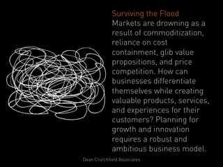The document outlines a six-step process to help businesses innovate and differentiate in overly competitive markets. It emphasizes the importance of a strong business model that includes a unique central idea, understanding market trends, and effective leadership. The process is designed to guide organizations in successfully implementing innovation, focusing on understanding their position, redefining their business strategy, and fostering collaboration within the leadership team.