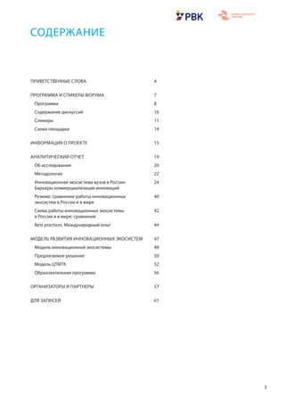 Документ описывает первый практический форум по трансферу технологий, который прошел в Москве 12-13 марта 2015 года. Основные цели форума заключались в вовлечении вузов и научных центров в практику технологического трансфера и выработке решений для повышения эффективности взаимодействия между научными и образовательными организациями и промышленностью. Программа мероприятия включала панельные дискуссии, кейс-конференции и презентации инновационных проектов, а также обсуждение барьеров и возможностей для развития российской инновационной экосистемы.