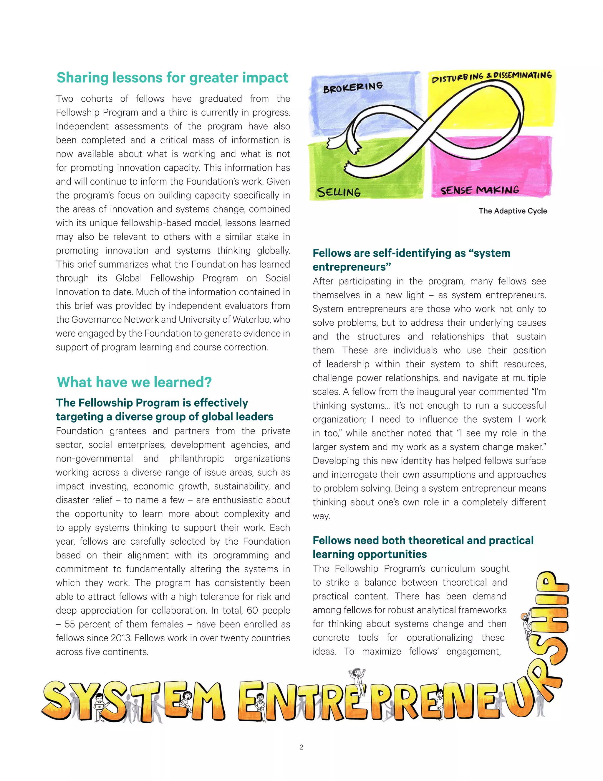 The Rockefeller Foundation's Global Fellowship Program on Social Innovation aims to build innovation capacity among leaders addressing complex social and environmental issues. Through its cohorts, the program has found that participants develop as 'system entrepreneurs' who challenge existing structures and foster collaboration across diverse sectors. The program emphasizes the importance of soft skills, contextual application of knowledge, and the value of unlikely partnerships while adapting to meet evolving needs for greater impact.