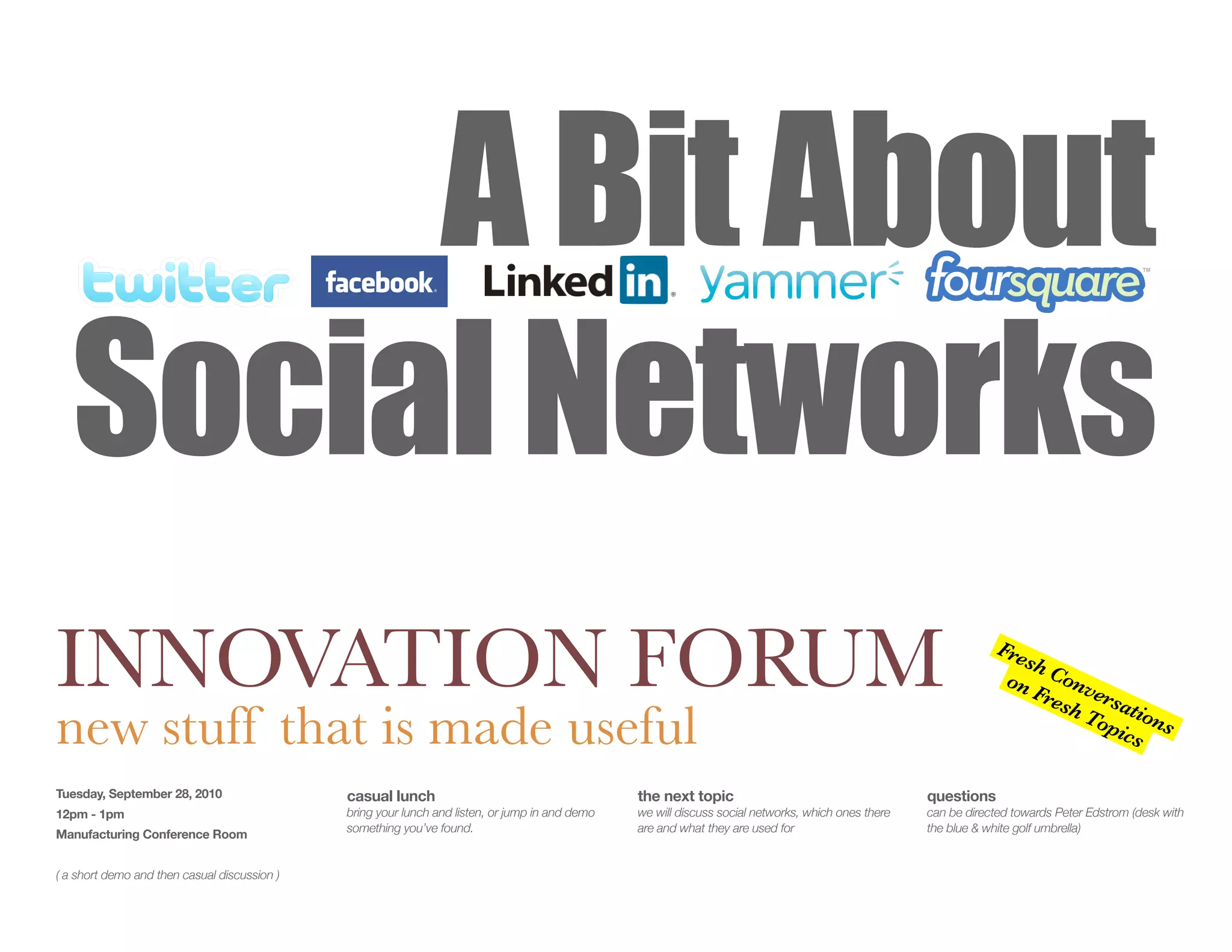 The document outlines an agenda for a social networks innovation forum scheduled for September 28, 2010, which includes presentations and discussions on the utility of various social networks. It features a casual lunch format where participants can share experiences and insights about platforms like Facebook and Twitter. The session encourages feedback and reflection on social network usage and its impact on personal and professional connections.