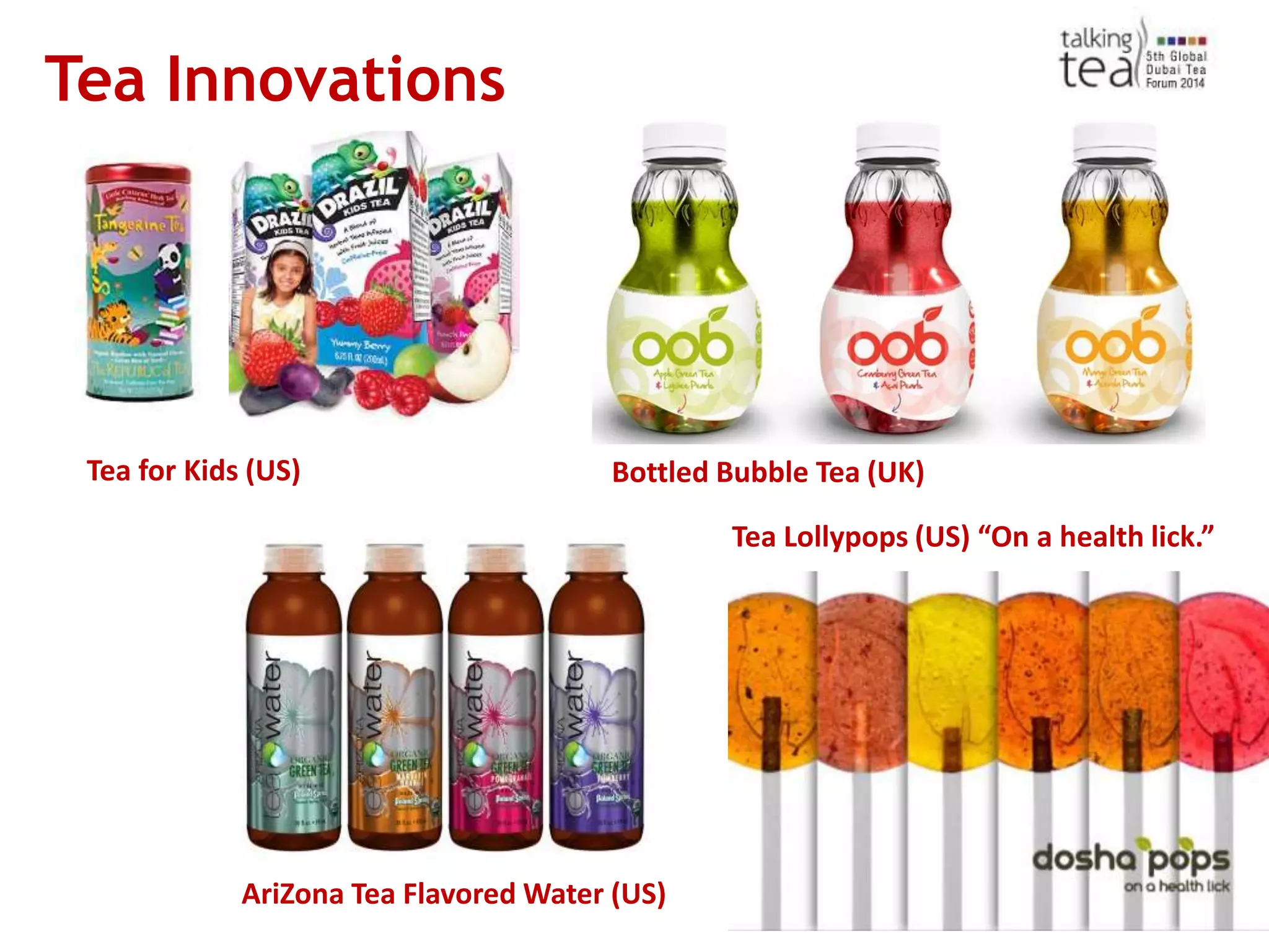 The document discusses innovations in the tea industry driven by rising consumer expectations in North America and the UK, highlighting product, packaging, and marketing innovations alongside trends toward ready-to-drink (RTD) tea. Major players like Lipton and Teavana are adapting to evolving consumer demands, demonstrating a significant focus on convenience and health-oriented tea options. The tea market shows substantial growth opportunities, particularly with the increasing popularity of single-serve formats and unique beverage offerings.