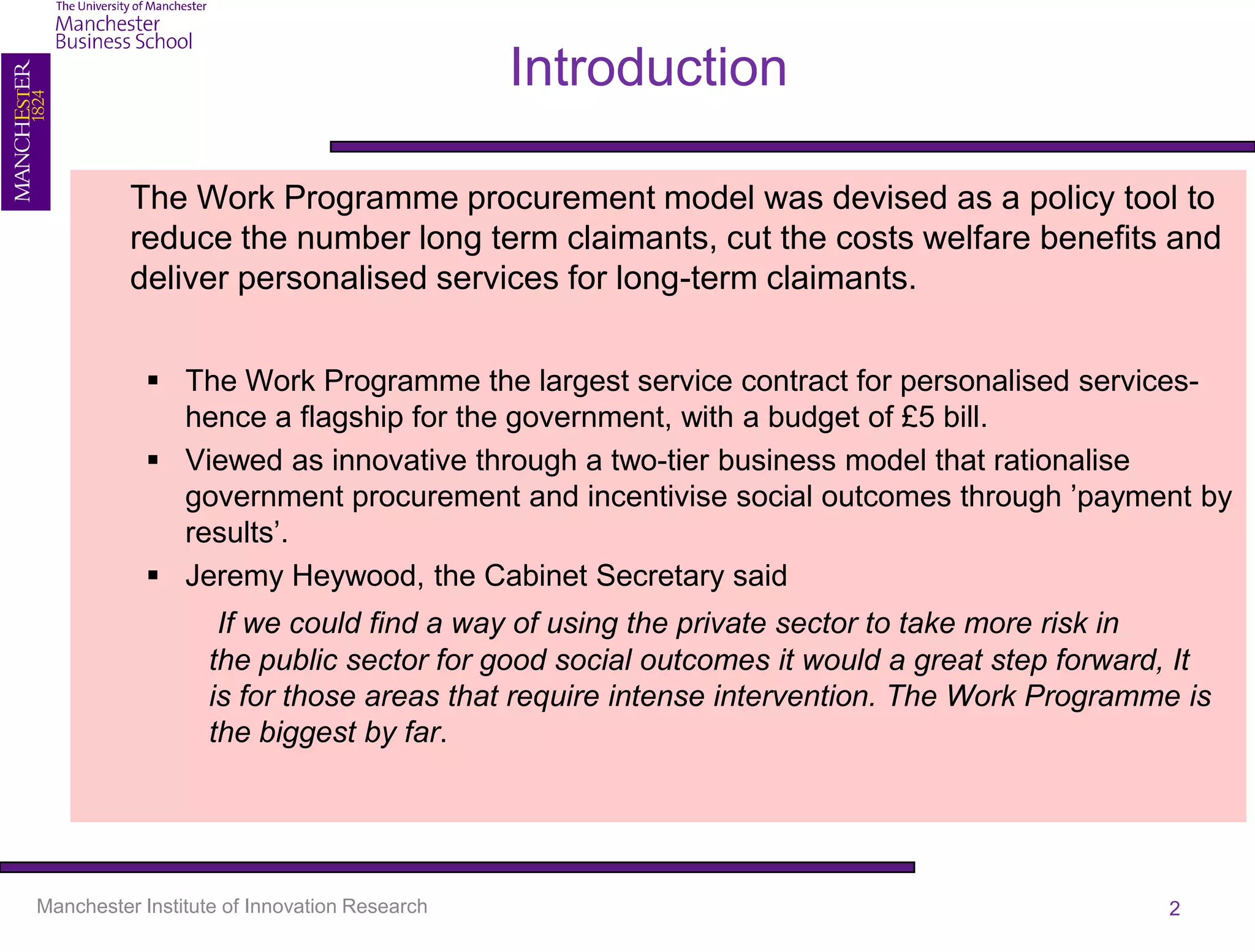 The Work Programme procurement model aimed to reduce long-term claimants, cut welfare costs, and deliver personalized services. However, a study found tensions between these goals and the two-tier procurement framework. While some specialized subcontractors innovated, the model favored large prime contractors over local specialists. It also weakened relationships between local job centers and other agencies important for local economic development. Locality collaboration and devolved budgets were proposed to better integrate services, stimulate local jobs, and sustain innovation.