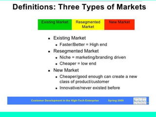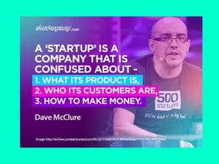 This document provides information about startups and entrepreneurship. It defines what a startup is, noting that it is not just a "cool name for a regular company" and differs from other types of businesses in its emphasis on experimentation and pivoting over rigid planning. Key traits of entrepreneurs are described, including vision, rule-breaking, optimism and persistence. The document also gives advice for developing an MVP and testing it to achieve product/market fit.