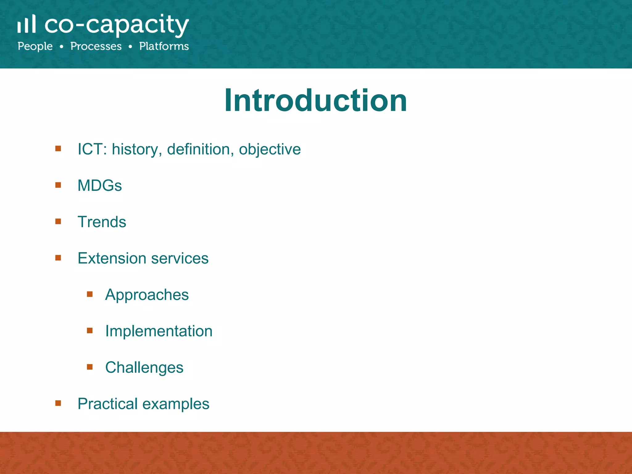 The document discusses the history and definitions of ICT and how it can be used to achieve Millennium Development Goals like poverty reduction and education. It provides examples of ICT being used to improve extension services for farmers from simple uses like providing market prices to more complex integrated systems. Challenges of implementation include converting information to digital formats and ensuring accessibility in local languages. Practical examples highlighted include an ICT center that helped artisans in India and services in India that provide agricultural information via SMS.