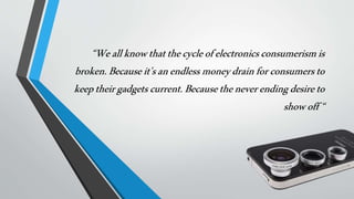 This document proposes a new modular phone system that allows consumers to customize their device by swapping out components like the camera, processor, battery and storage as needed. Some key points: