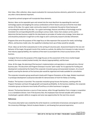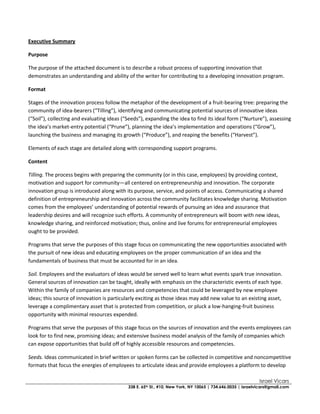 The document describes an 8-stage process for supporting innovation within an organization: 1) Preparing employees by providing context and support for entrepreneurship, 2) Identifying potential sources of innovative ideas, 3) Collecting employee ideas and evaluating them, 4) Expanding ideas by considering user needs and business models, 5) Further assessing ideas prior to creating business plans, 6) Planning the implementation and operations in a business plan, 7) Launching successful businesses with support, and 8) Generating revenue from successful ideas and learning from failures. Programs are proposed to support each stage, from communicating opportunities to providing consultation on business plans.