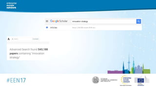 The document discusses innovation strategy and provides examples of how to develop an innovation strategy canvas. It begins with an overview of what an innovation strategy is and why it is important for companies to have one. It then introduces the innovation strategy canvas as a tool to help structure an innovation strategy. The canvas covers various elements of an innovation strategy including role, fields, targets, market entry, implementation and more. The document provides examples of how companies have used the canvas to develop strategies and highlights the benefits they experienced such as funding and new collaborations. It concludes with a quote from a company CEO discussing how using the innovation strategy canvas helped focus their innovation efforts.