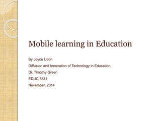 This document discusses mobile learning and its implementation in education. It defines mobile learning as using interactive technology to support teaching and learning. It lists different mobile technologies that can be used, such as tablets, smartphones, laptops, and interactive whiteboards. It also discusses some educational applications that can be used on mobile devices. The document then discusses the need for mobile learning to improve students' academic performance and engagement. It reviews several research studies on effective uses of mobile technology in education. Finally, it discusses some challenges in developing mobile learning and ensuring its adoption through teacher training and support.