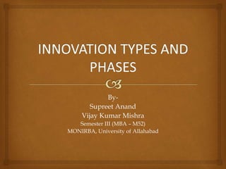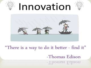 The document discusses the concept of innovation as the introduction of new methods, products, or processes to create value for firms and consumers. It distinguishes between innovation and invention, highlighting that innovation requires a commercial application alongside creativity, iteration, and handling of failures. Various types of innovation are explored, including product, process, and service innovation, alongside the phases of design and implementation.