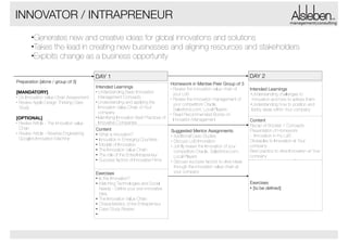 The document outlines a comprehensive framework for innovation management, emphasizing the roles of entrepreneurs and intrapreneurs in driving creative ideas and business opportunities. It discusses various models of innovation, including the innovation value chain, and highlights challenges and best practices for fostering innovation within organizations. The content includes case studies, exercises, and intended learning outcomes focused on understanding and addressing innovation challenges across different contexts.