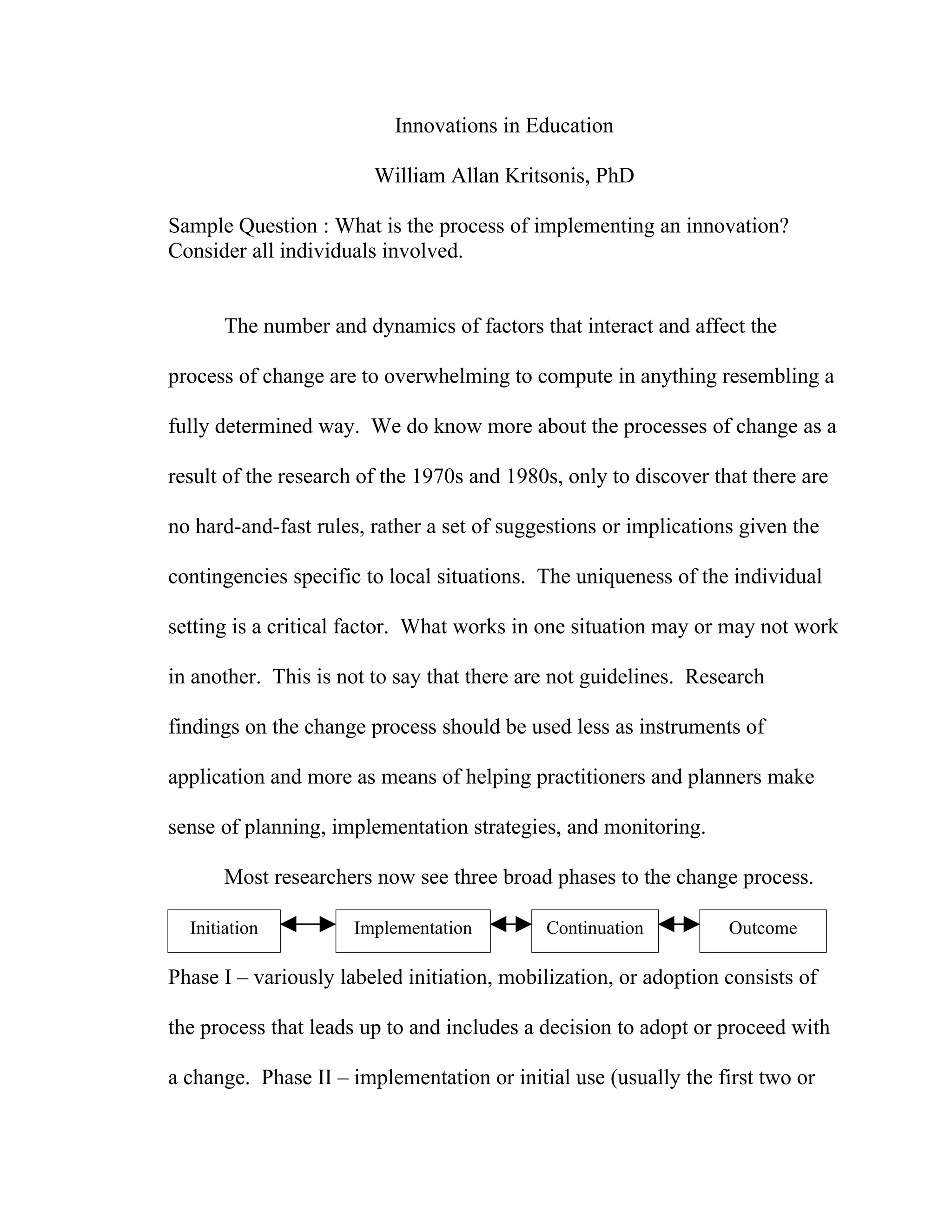 The document discusses the process of implementing educational innovations, highlighting the complexity and variability of change across different settings. It outlines three phases of change: initiation, implementation, and continuation, emphasizing the importance of relevance, readiness, and resources in the initiation process. The text also examines factors influencing implementation, including local characteristics, external influences, and the critical role of leadership and community support.