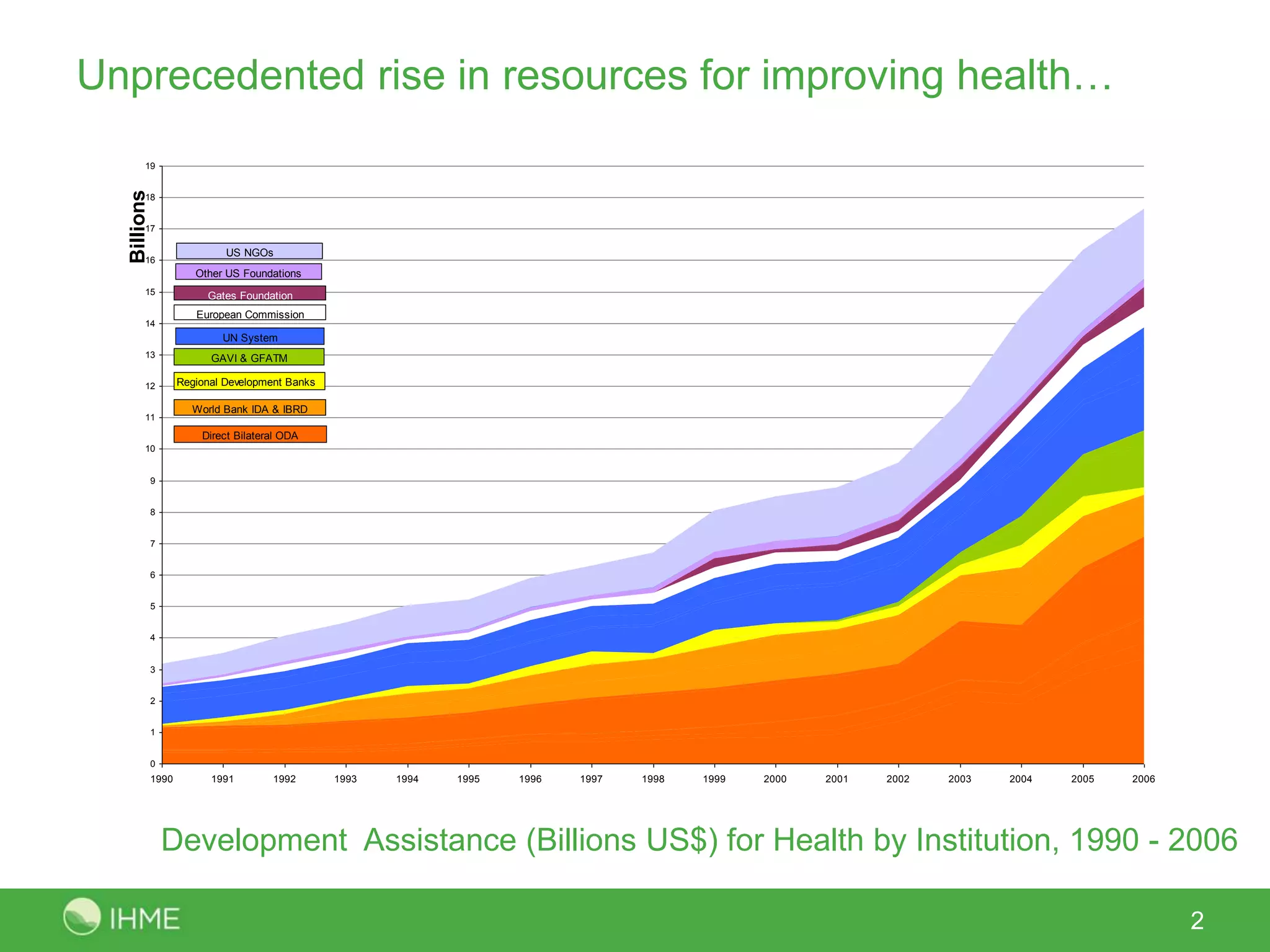 The document discusses innovations in health service evaluation techniques and highlights the significant rise in global health funding from various organizations between 1990 and 2006. It emphasizes the proliferation of global health goals and initiatives, along with the implementation of national health sector reforms in several countries. The text raises several questions concerning the effectiveness and comparative progress of health systems, stressing the need for new approaches to monitoring and evaluation amidst increasing financial constraints.