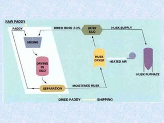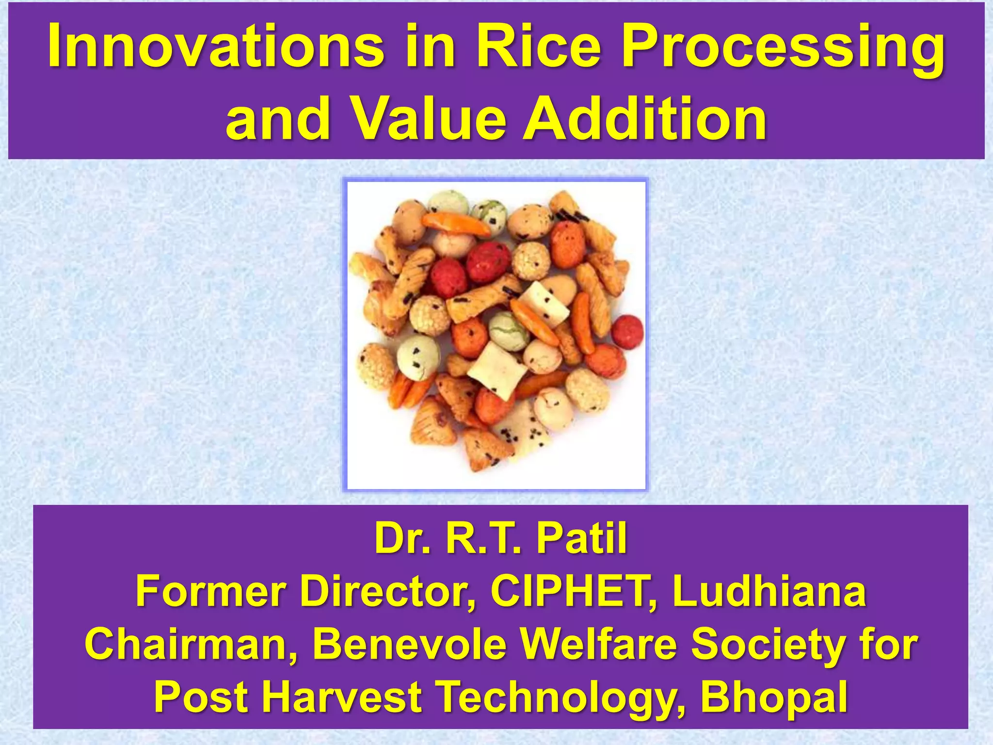Brown rice contains magnesium, fiber, and other nutrients that can help reduce health issues like asthma, high blood pressure, and colon cancer. Rice provides vitamins, minerals, and antioxidants and can aid bowel health, blood sugar levels, cholesterol, and blood pressure. Recent rice processing innovations include soft drying of high moisture rice, curing rice for partial parboiling, enzymatic bio-polishing of brown rice, making rice biscuits, crisped rice snacks, and microwavable puffed rice. Vitamin fortification of rice and quick cooking rice have also been developed.