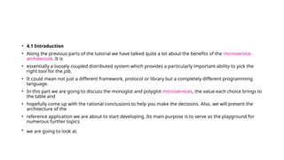The document discusses the advantages of microservice architecture, focusing on monoglot versus polyglot microservices, and the importance of evaluating programming language choices based on organizational expertise. It highlights the risks of tight coupling between services and the potential complications of using multiple programming languages in a microservices environment. The tutorial introduces a reference application, 'JCG Car Rentals,' which will be built with an emphasis on microservices principles, primarily using Java but recognizing the use of other languages as well.
