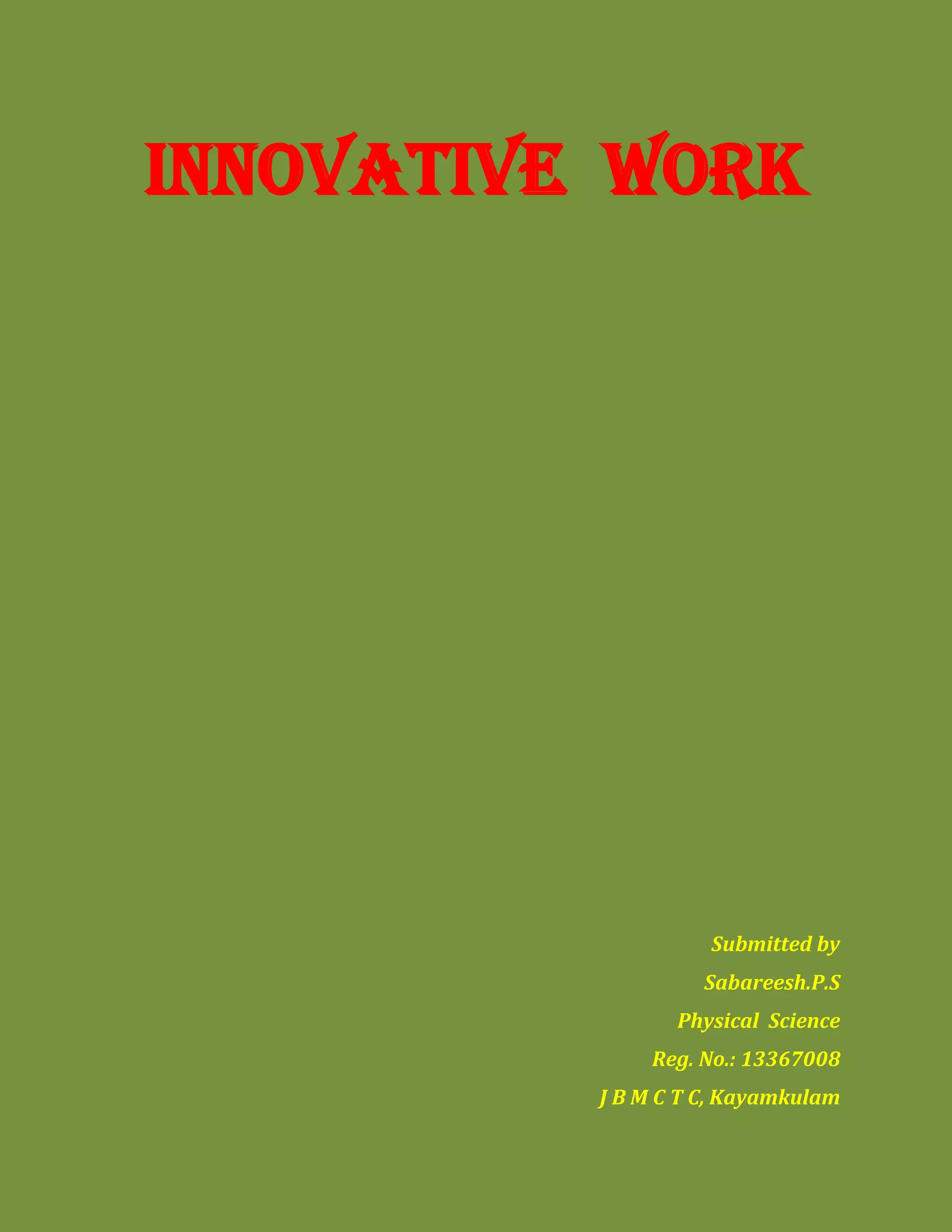 The document is a submission by Sabareesh.P.S for innovative work in physical science. It provides his registration number 13367008 and indicates he is a student at J B M C T C, Kayamkulam.