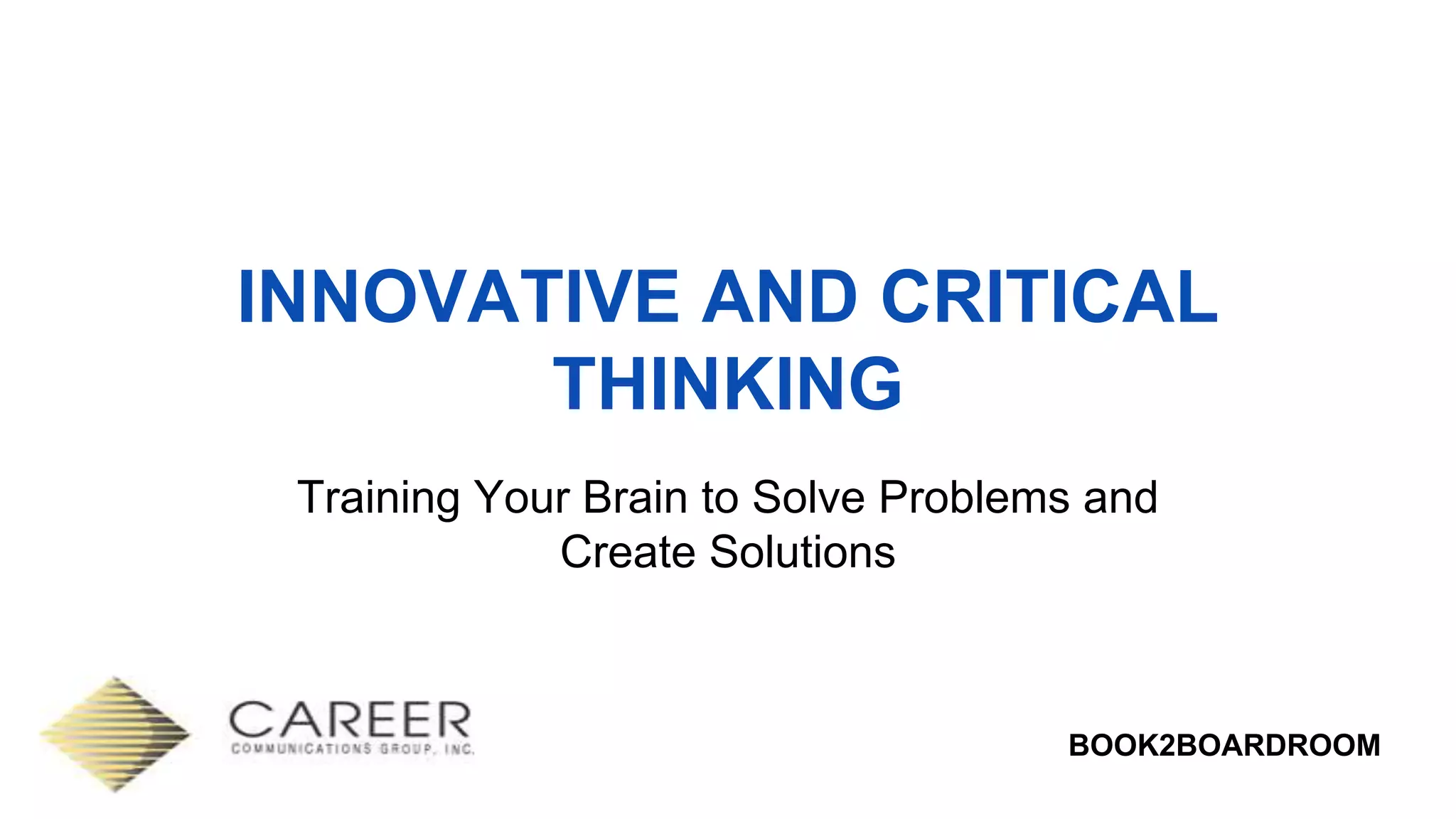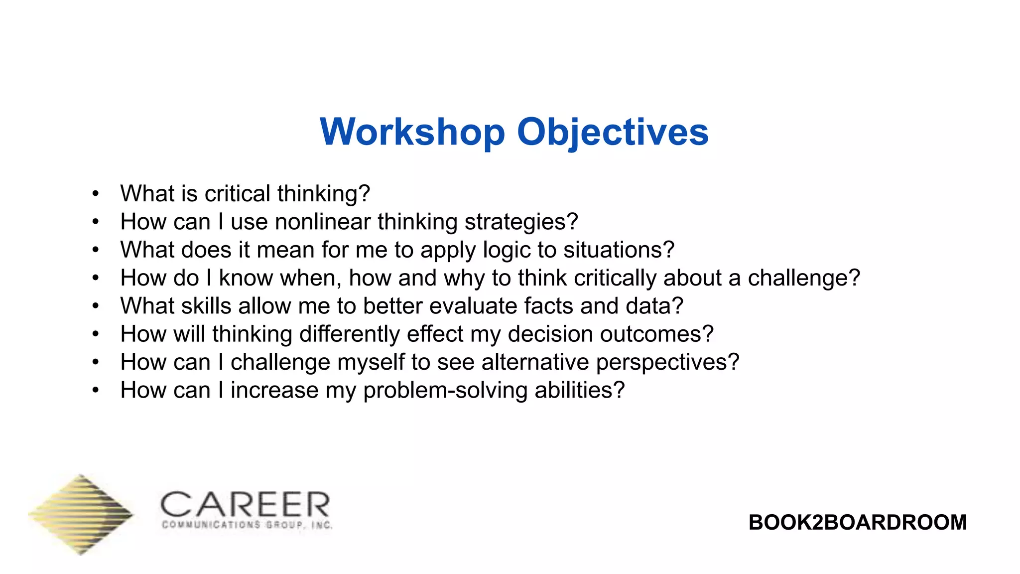 The document outlines a workshop on critical and innovative thinking, aiming to enhance problem-solving skills through various modules. It covers aspects such as the importance of critical thinking, nonlinear thinking strategies, logical reasoning, and methods to evaluate information effectively. Additionally, it emphasizes the significance of perspective-taking, emotional intelligence, and adopting a structured approach to decision-making.