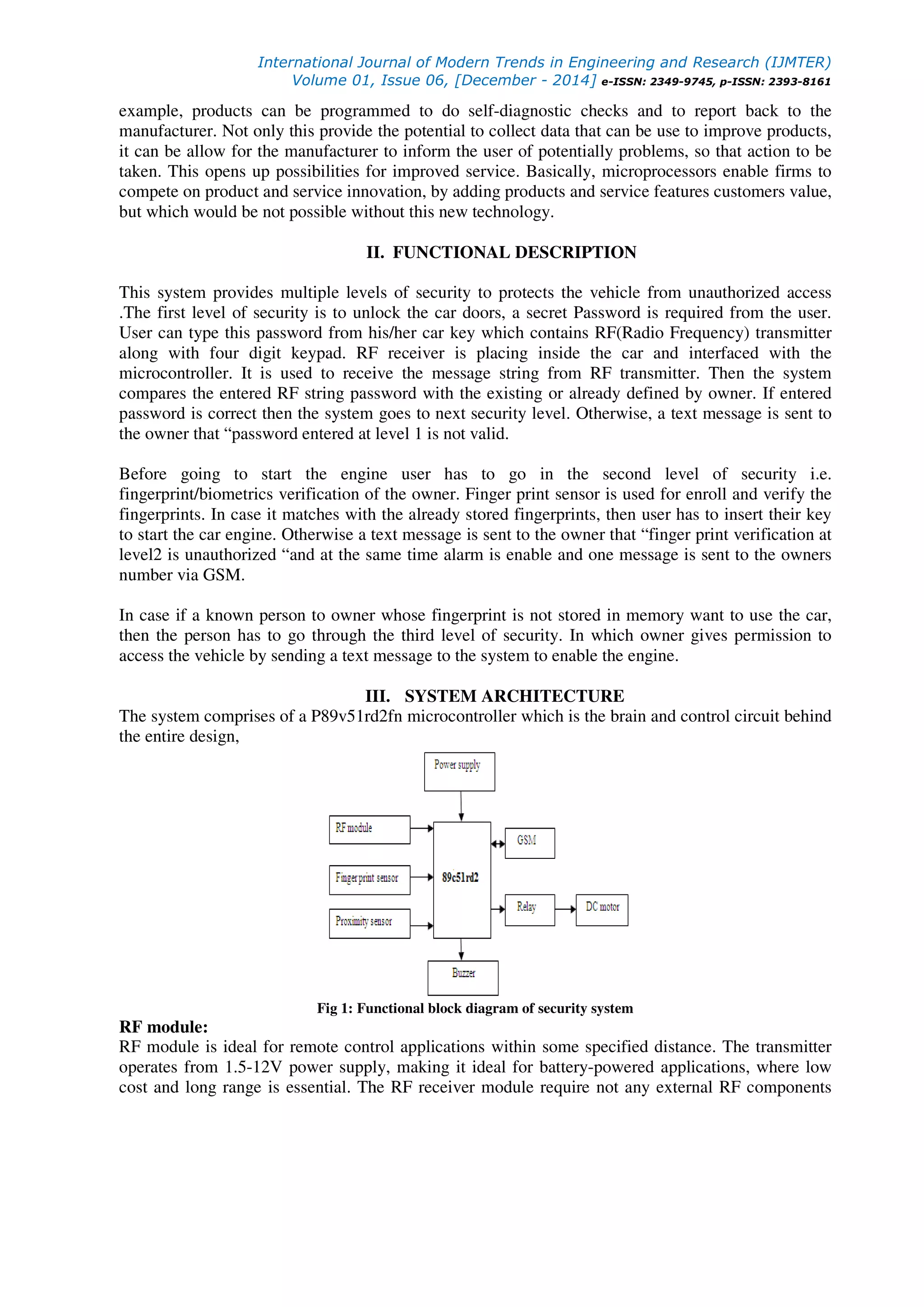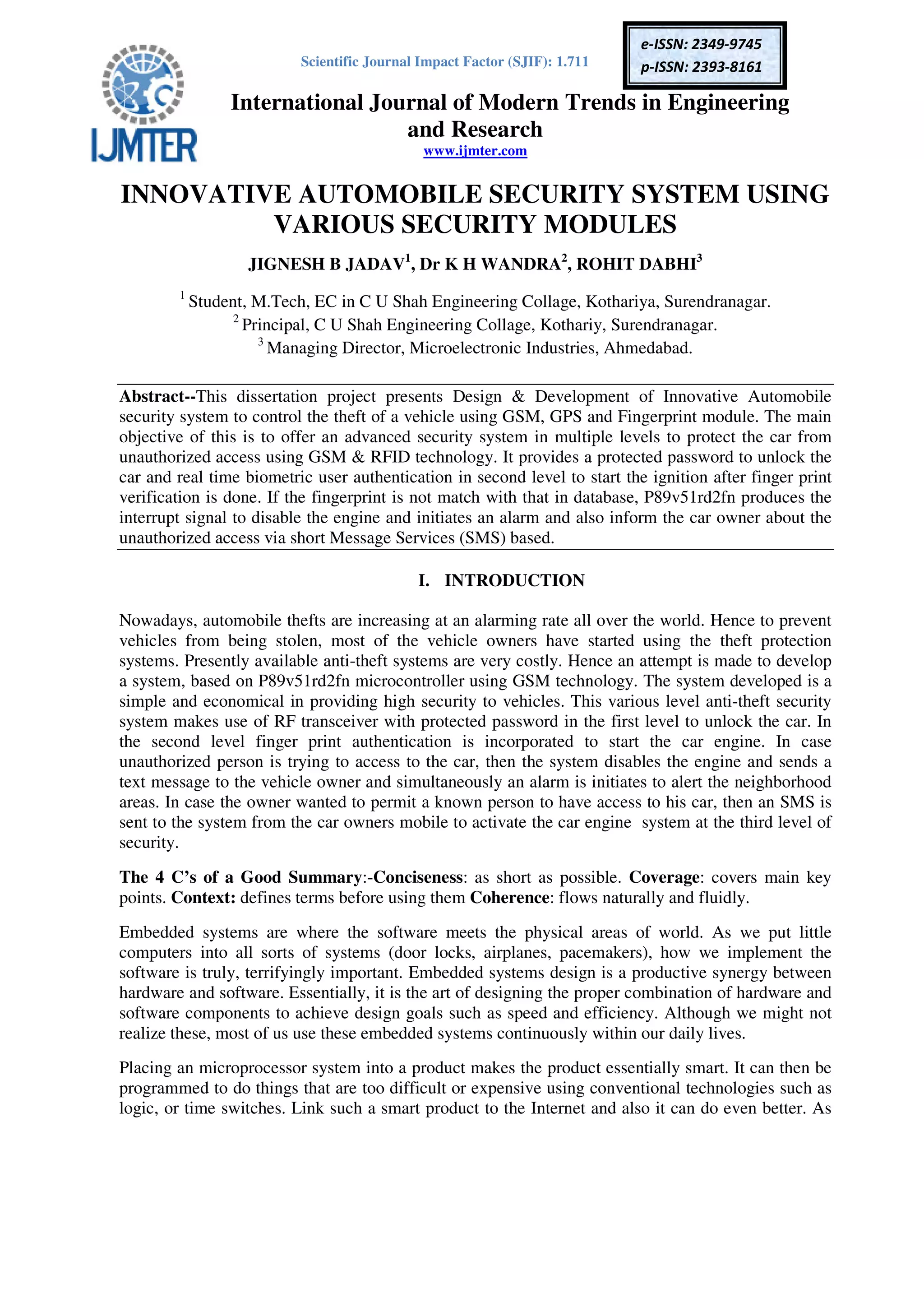 This document presents the design and development of an innovative automobile security system that utilizes GSM, GPS, and fingerprint modules to prevent vehicle theft. The system incorporates multiple levels of authentication, requiring a password to unlock the car and biometric verification to start the engine, while also alerting the owner of unauthorized access through SMS. It aims to provide a cost-effective, high-security solution for protecting vehicles against theft.