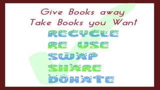 This document presents a business plan for a book swap and trade project among university students. The objectives are to create a bookstall to facilitate exchanges, reduce costs for students, and promote reuse. Students would bring books they want to swap and take books from the available selections. Funds from donated books would help students in need. Initially the project requires permission, volunteers, and a small budget for supplies and inventory. Surveys found student interest and a pricing model is proposed. The project aims to be sustainable while providing environmental and social benefits to the university community.