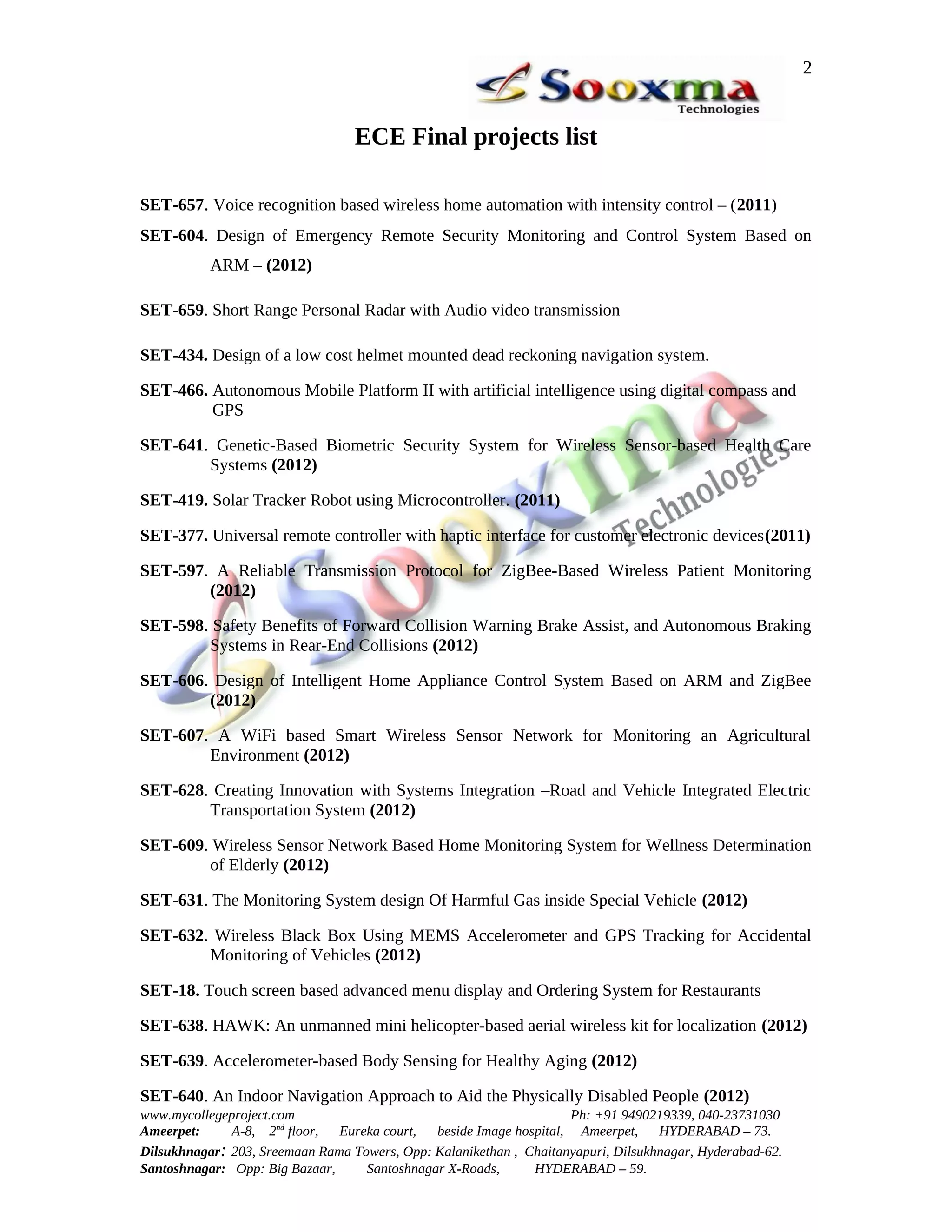 This document lists technologies and final projects completed by students at an ECE department between 2011-2013. It includes 50 technologies such as ARM, image processing, and Zigbee and over 75 final projects related to areas like wireless home automation, health monitoring, vehicle safety systems, and assistive technologies for disabled individuals. Many projects involve sensors, microcontrollers, and wireless communication standards. The document provides details on student projects that utilize embedded systems and sensors for applications in various domains.
