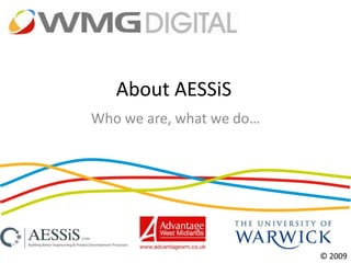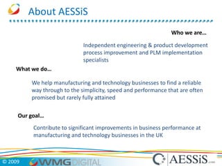 AESSiS is an engineering consultancy that specializes in product lifecycle management (PLM) implementation and process improvement to help manufacturing businesses achieve better performance. PLM is a strategic approach to managing product information throughout the lifecycle from concept to end of life. It aims to provide a single source of truth, configuration management, reduced waste, and increased innovation. PLM tools help manage parts, relationships between parts, documents, changes to parts, and the lifecycle of a part from new to obsolete. Aras is an open source PLM platform that provides an enterprise solution with no upfront costs and uses existing IT infrastructure and skills.