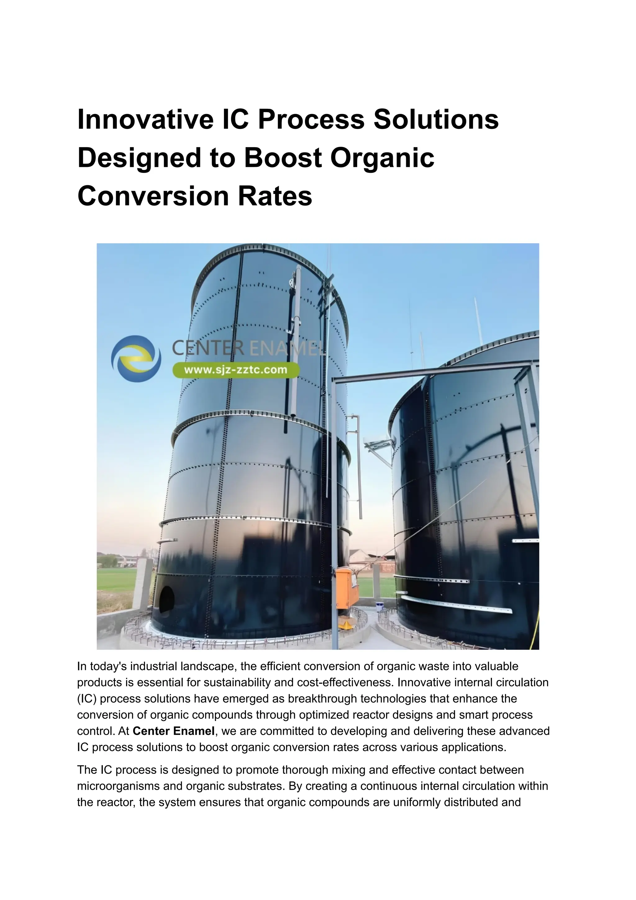 Center Enamel offers innovative internal circulation (ic) process solutions that optimize the conversion of organic waste into valuable products, enhancing efficiency and sustainability in various industries. These systems reduce operational costs, improve renewable energy production, and meet environmental standards by facilitating complete degradation of organic materials. Center Enamel is committed to continuous innovation and tailored solutions to boost organic conversion rates, ensuring long-term economic and environmental benefits for clients.