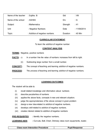 This document outlines an innovative teaching manual for a lesson on adding negative numbers. It includes the learning objectives, which are for students to recall knowledge about numbers, describe properties of negative numbers, apply concepts to new problems, and develop skills in adding negative numbers. The lesson plan consists of pre-assessment activities using a number line, group activities subtracting balls of different colors to represent negative numbers, example problems, and a review activity. The goal is for students to understand how to add negative numbers.