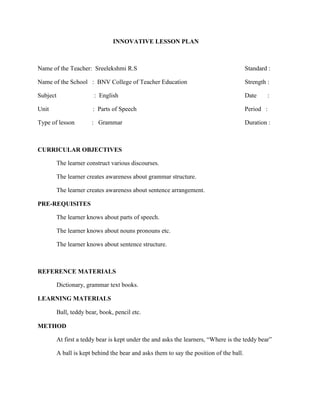 This lesson plan is for a grammar class on parts of speech for English. The objectives are for students to construct discourses, create awareness of grammar structures and sentence arrangement. Students already know about parts of speech, nouns, pronouns and sentence structure. The lesson uses objects like a teddy bear, ball, book, and pencil placed in different positions to teach students to identify and describe locations using relevant parts of speech. This interactive method makes grammar easier for students to understand and remember than through rote learning alone.