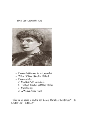 This document provides a lesson plan for teaching a story called "The Light on the Hills" to 1st standard students. The lesson plan outlines curricular statements about developing interests in hard work and making life purposeful. It summarizes the plot of the story, which is about a boy who is a painter and works hard to finish a painting for his late sister. The plan details hints that will be given to students to help them develop the story, and describes how the teacher will analyze the students' stories, explain difficult words, and discuss how perfect love and selfless work can bring happiness.