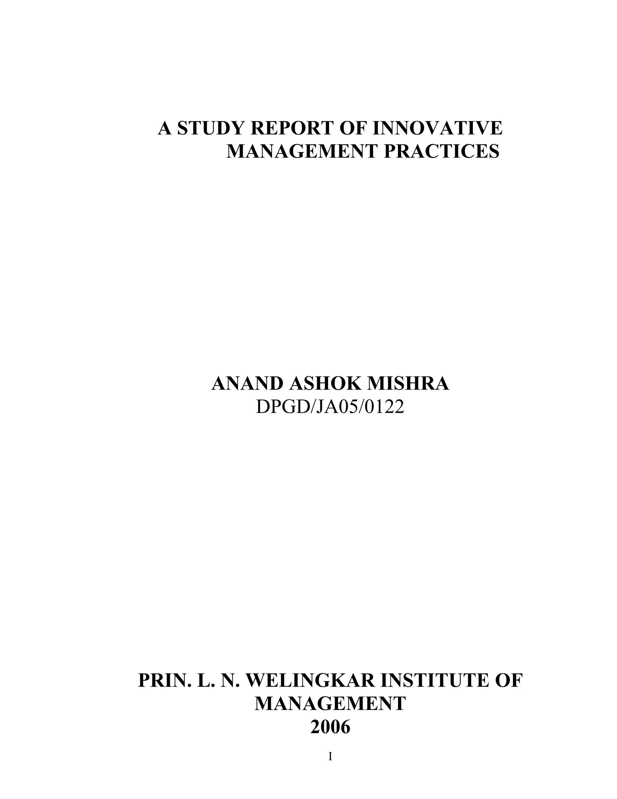 This document is a study report on innovative management practices by Anand Ashok Mishra. It includes an introduction where Mishra discusses management, management practices, challenges, and driving innovations in organizations. The report will focus on budget and performance integration and human capital management. It provides background on IPCL and the Maharashtra Gas Cracker Complex where Mishra is employed. The methodology section outlines the problem, scope, and objectives of the study. The conclusions and recommendations are in section D, with limitations in section E.