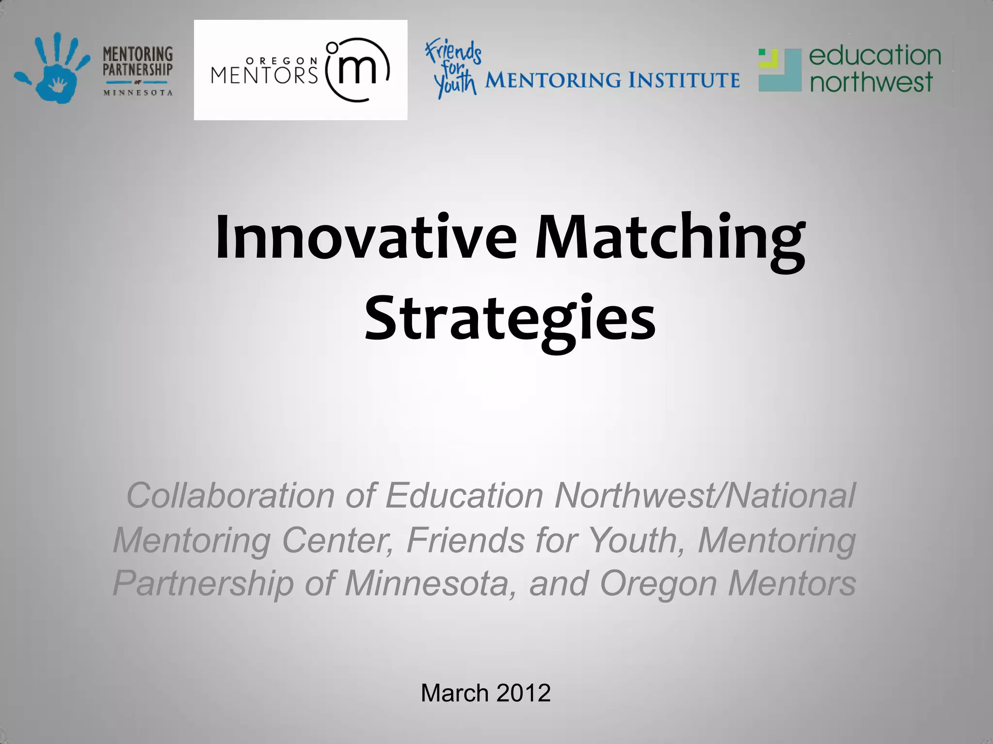 The document outlines a webinar series on innovative mentoring strategies, emphasizing the significance of mentor-mentee relationships over mere matching. It discusses research findings on effective mentoring practices and highlights best practices for matching youth and mentors based on shared interests. Additionally, it includes details about participants, future webinar topics, and contact information for the organizers.