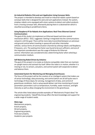 The document outlines various innovative mechatronic projects for engineering students, emphasizing the integration of mechanical, electrical, and computer engineering to solve real-world problems. It details specific projects such as an omnidirectional mobile robot, an industrial robotic pick-and-sort system, and a self-balancing robot among others. The Takeoff Edu Group offers resources and support for students to successfully complete these projects.