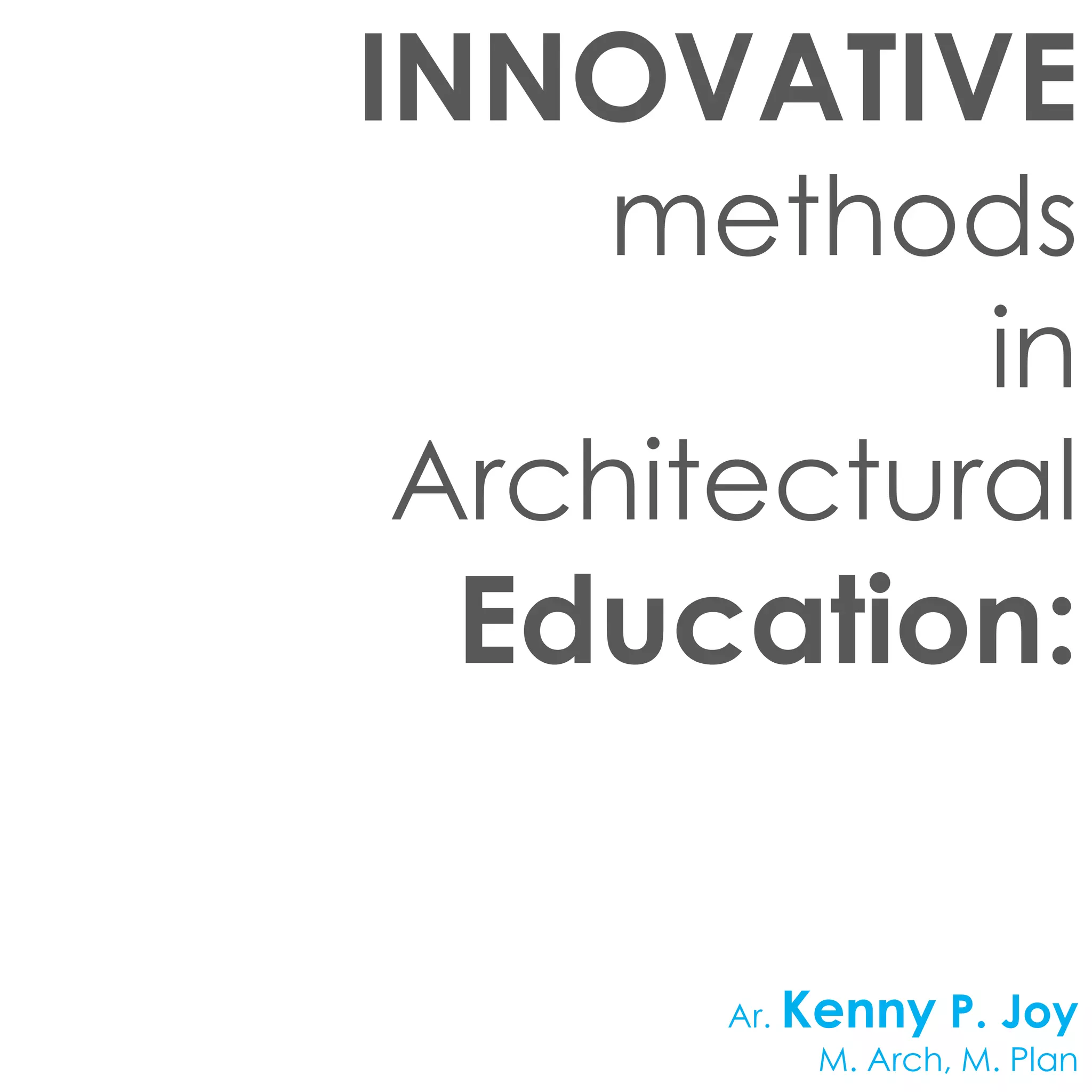 This document summarizes an innovative approach to architectural education presented by Ar. Kenny P. Joy. It begins with Joy's background and credentials. It then discusses some limitations of conventional teaching methods, emphasizing lecture-based learning and a lack of practical application. The new approach focuses on hands-on workshops, collaborative learning between academics and practitioners, and studio-based learning that integrates various subject areas into design projects. It aims to teach students the design process rather than just the product. Key aspects include theme-based studios, multi-stage design studies, and evaluating the design process over just the final output. The goal is to stimulate curiosity and allow students to learn through their own choices and mistakes.