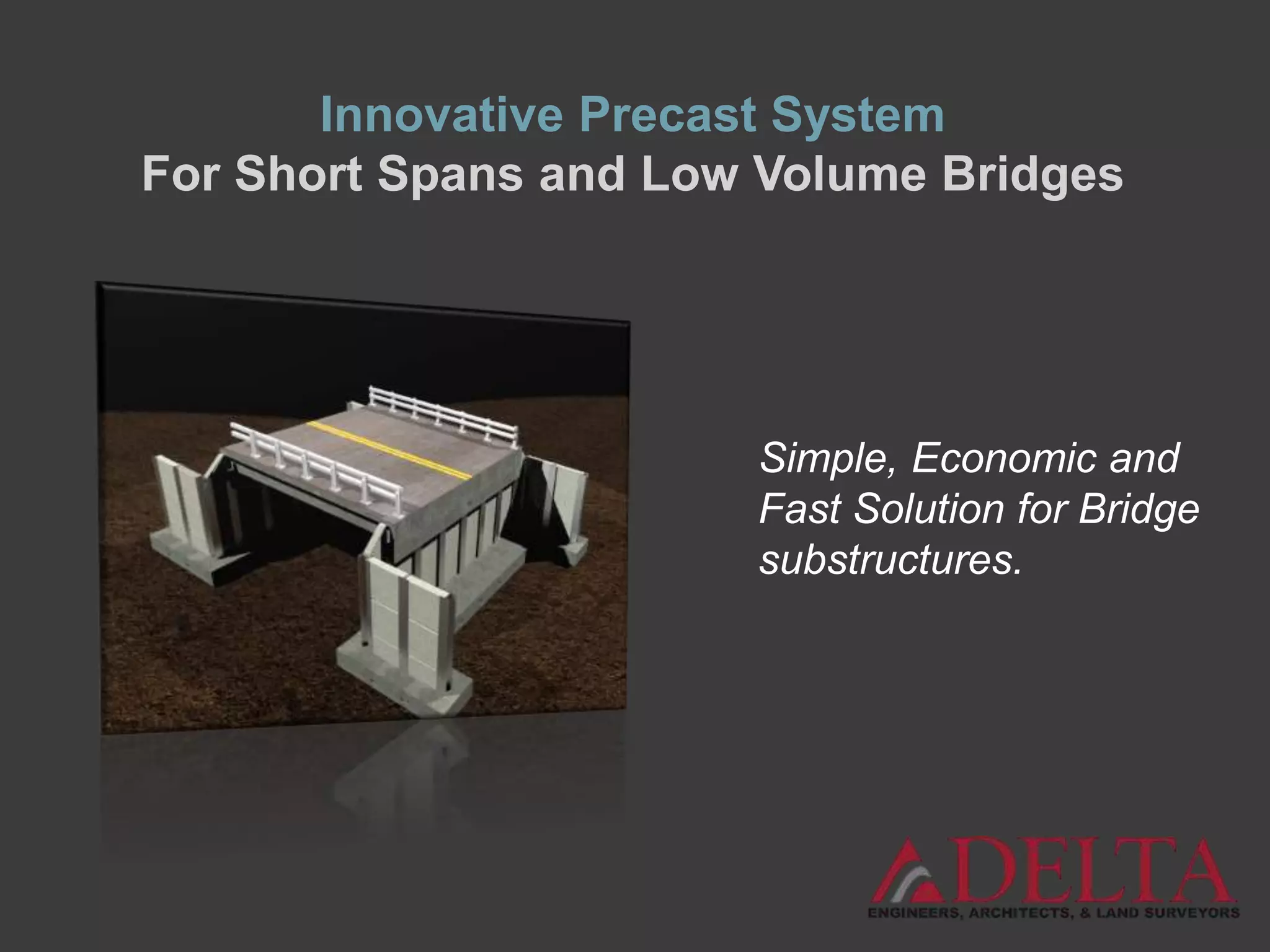 The document describes an innovative precast system for bridge substructures for short spans and low volume bridges. The system uses precast concrete components including a cap, lagging, and footings connected by mechanical couplers and supported by H-piles embedded in the footings. It offers benefits over conventional cast-in-place systems like reduced construction time, less concrete and reinforcement needed, and easier installation with smaller equipment. The precast system was determined to be the preferred alternative described for replacing an existing timber bridge.