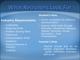 The document presents innovative teaching methodologies emphasizing the importance of leadership, analytical and problem-solving skills in students. It discusses the constructivist approach, where teachers facilitate active learning through methods like role play and mind mapping, and highlights Howard Gardner's theory of multiple intelligences to cater to diverse learning styles. Additionally, it outlines essential teaching techniques to engage students, assess learning, and provide constructive feedback.