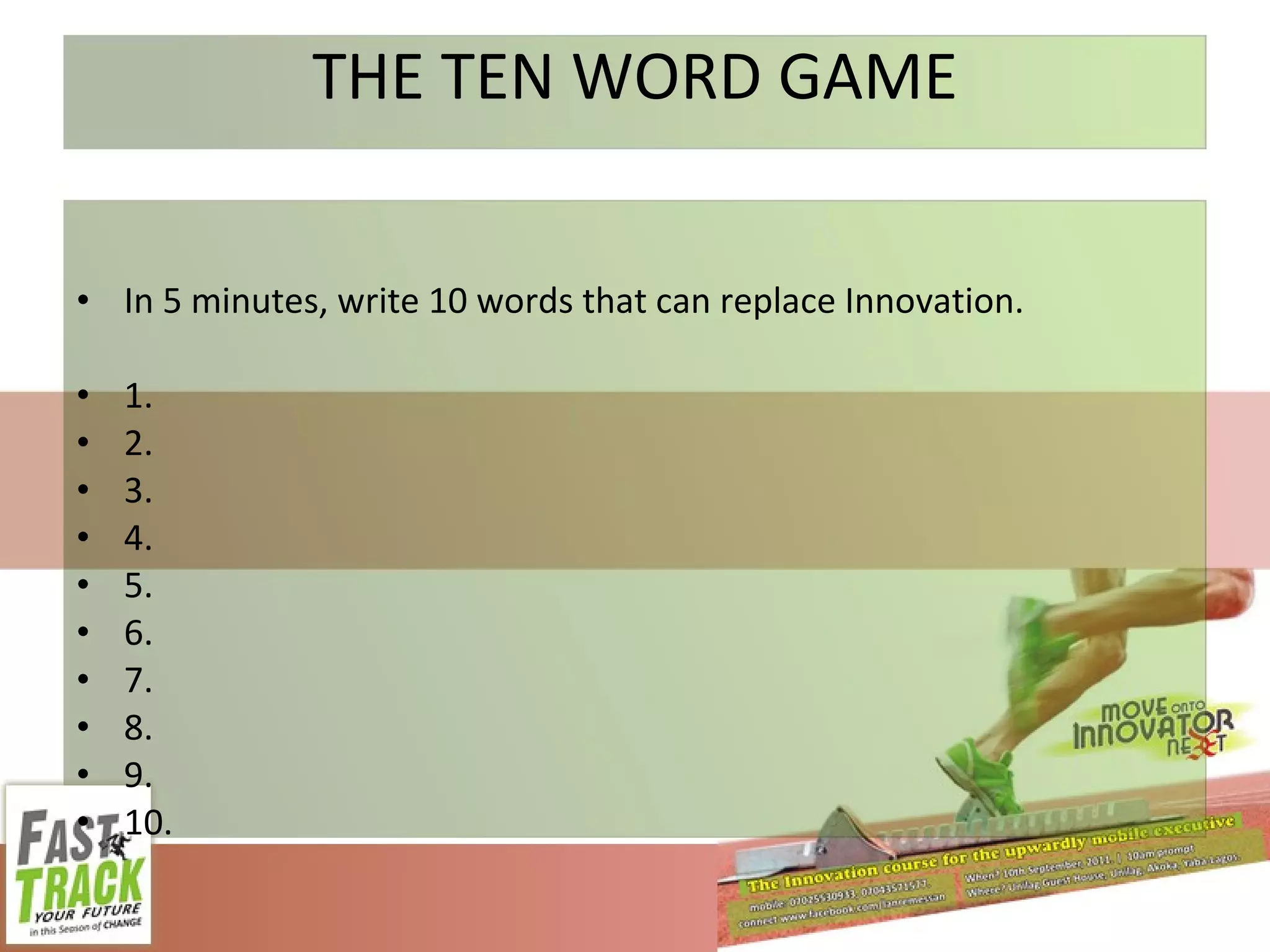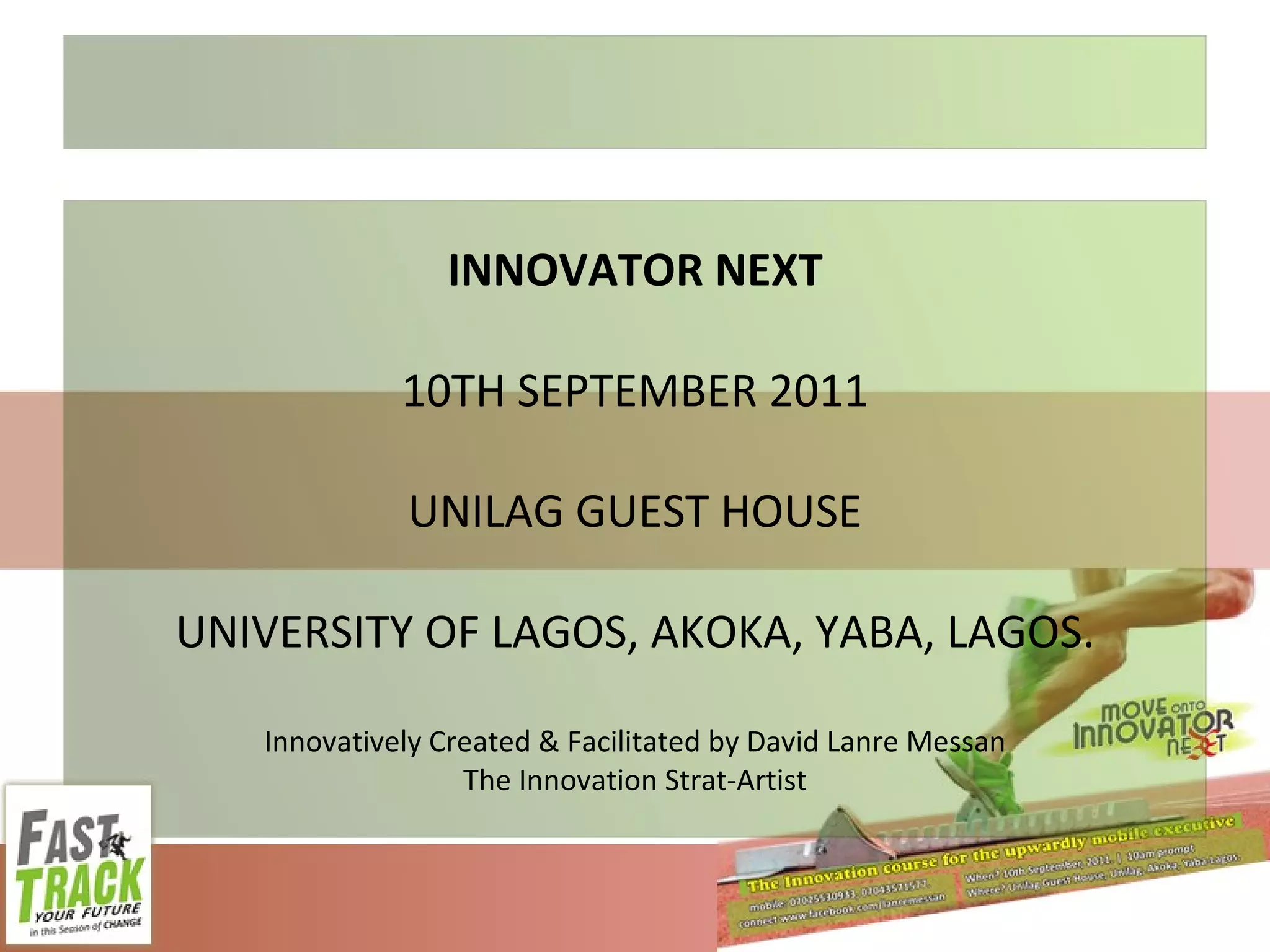 This document summarizes notes from an innovation workshop held at the University of Lagos Guest House in Nigeria. It includes brainstorming questions, definitions of key innovation terms, barriers and drivers of innovation, and characteristics of an "Innovator Next" - someone with a high propensity to innovate. Participants were encouraged to think creatively and develop their innovative skills through conceptual and network thinking.