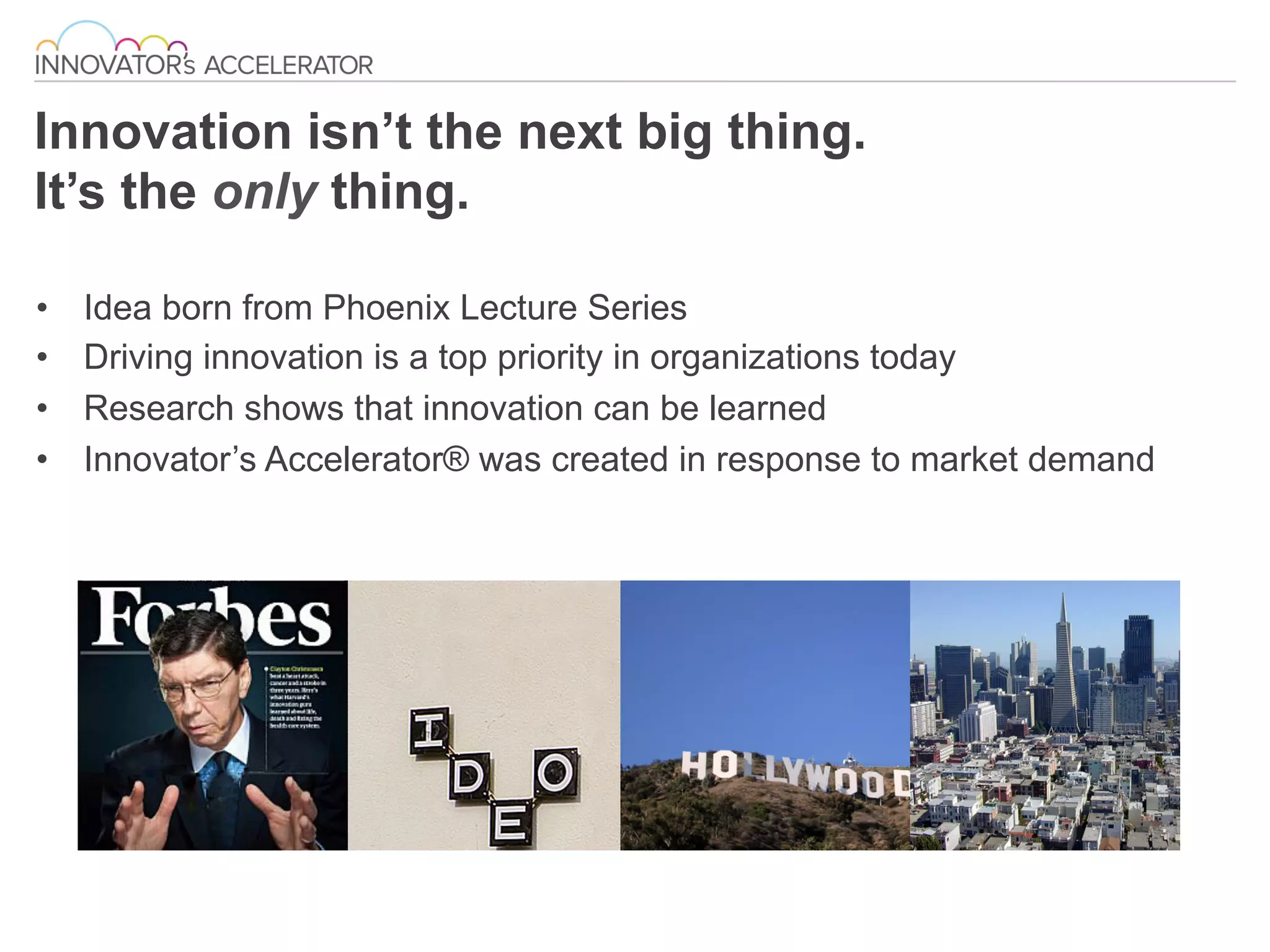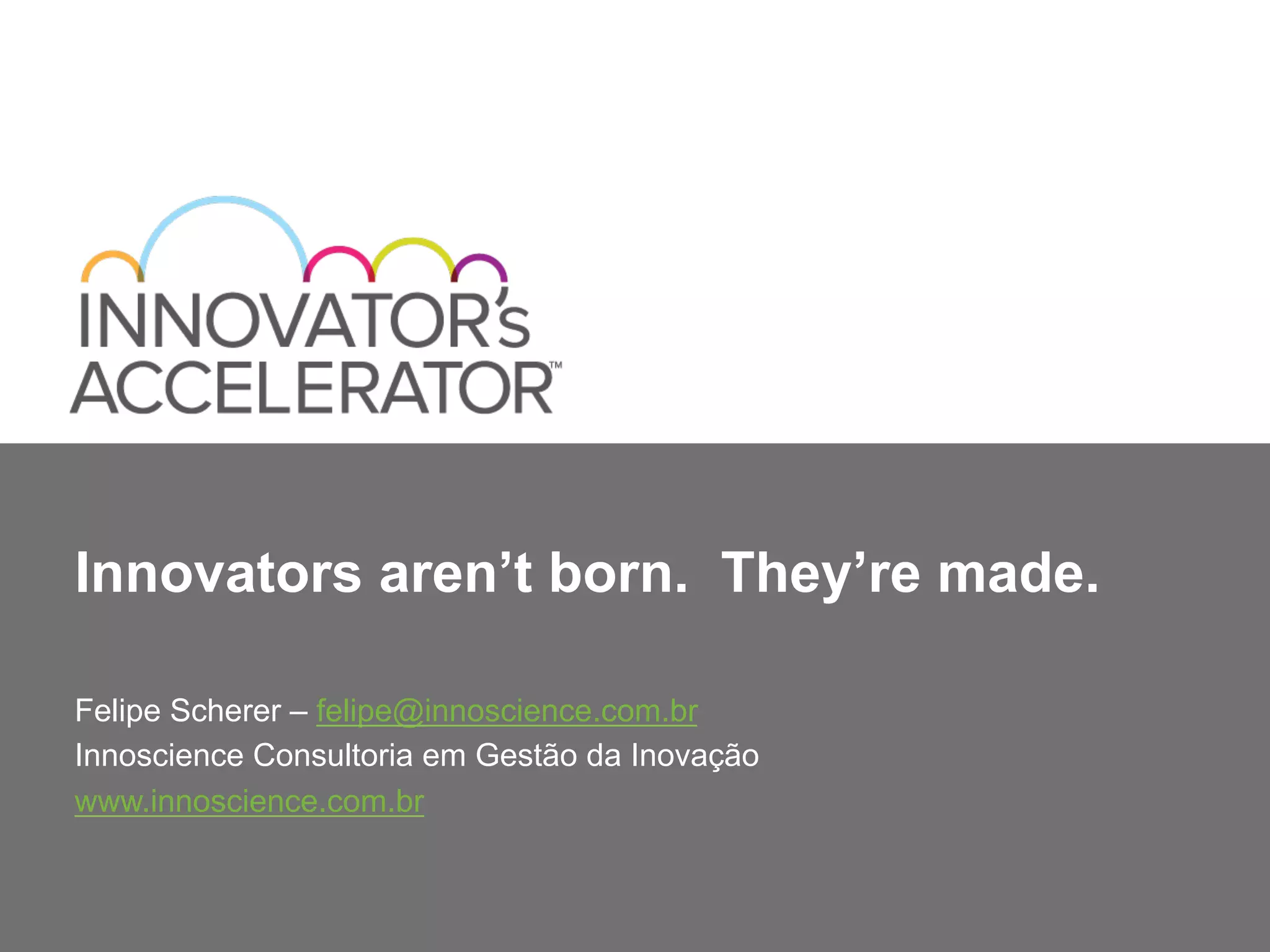 The document discusses the Innovator's Accelerator program developed by Innoscience to promote innovation skills in organizations. It highlights the involvement of renowned experts and outlines two learning solutions with structured content and personalized support. The program emphasizes the idea that innovation can be learned and is essential for organizational success.