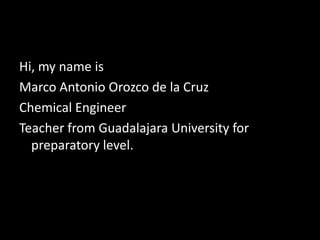 This document introduces Marco Antonio Orozco de la Cruz, a chemical engineer and teacher from Guadalajara University who has been teaching chemistry, physics, and mathematics for teens and adults. It provides an overview of binary compounds, including how they are classified and named using both traditional and IUPAC nomenclature. Examples are given of naming acid compounds specifically, such as hydrogen chloride under traditional naming and hydrogen chloride under IUPAC naming. Readers are invited to contact Marco Antonio with any questions.