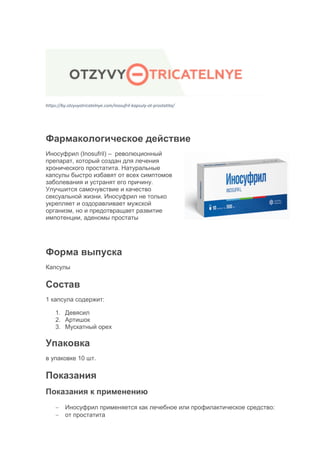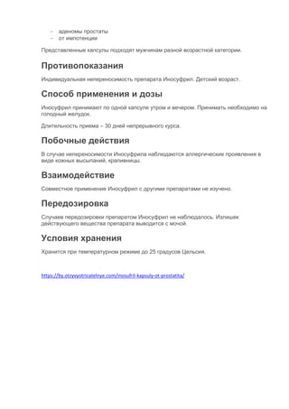 Иносуфрил - это инновационный препарат в капсулах для лечения хронического простатита, который направлен на устранение симптомов заболевания и улучшение качества сексуальной жизни. Он содержит натуральные компоненты, такие как девясил и артишок, и рекомендуется для мужчин разных возрастов с показаниями на простатит и аденому простаты. Препарат должен приниматься по одной капсуле дважды в день на голодный желудок в течение 30 дней, с возможными побочными эффектами в виде аллергических реакций.