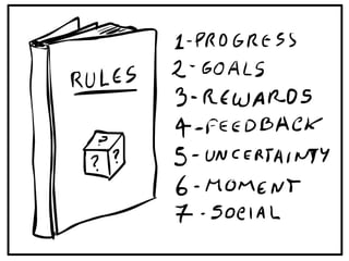 The document lists various resources and references related to gamification, game design, and the impact of games on learning and engagement. Key authors and works include R. Koster, J. McGonigal, and J. Schell, highlighting the educational and cultural significance of games. Additionally, it includes links to presentations on user experience and collaboration through gaming principles.