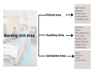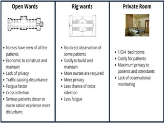 The document discusses various factors affecting hospital ward planning, including auxiliary areas like day rooms and storage facilities, and innovations aimed at improving patient care and operational efficiency. It highlights the importance of effective nursing management, staff scheduling, and equipment maintenance in enhancing patient satisfaction and safety. Additionally, it outlines the admission and discharge processes, emphasizing the need for clear communication and cooperation between hospital staff and patients.
