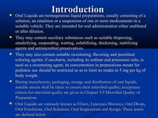 This document discusses liquid dosage forms. It defines various types of liquid dosage forms including solutions, suspensions, emulsions, and colloids. It describes advantages like ease of swallowing and more rapid drug absorption. It also discusses problems like bulkiness, stability issues, and accurate dosing. It provides definitions and examples of different oral liquid formulations like elixirs, mixtures, and syrups. Finally, it outlines some common tests for oral liquids including uniformity of content and microbial quality.