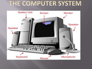 This document provides an overview of computer components and characteristics. It discusses that computers are programmable machines that can execute prerecorded lists of instructions. Modern computers are electronic and digital, with hardware comprising the physical components and software comprising instructions and data. The main hardware components are the central processing unit (CPU), memory, mass storage devices, input devices, and output devices. The CPU contains the control unit and arithmetic logic unit. Computers can be classified by size and power as personal computers, workstations, minicomputers, mainframes, and supercomputers. The document then discusses characteristics of computers such as speed, accuracy, reliability, storage, retrieval of data/programs, automation, versatility, communications, diligence,