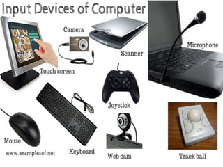 This document provides information about different types of input devices for computers including keyboards, mice, joysticks, trackballs, and touch screens. It discusses how each device is used to control movement of the cursor or pointer on a display screen. The document is part of an online computer class about input and output devices and assigns homework from the chapter.