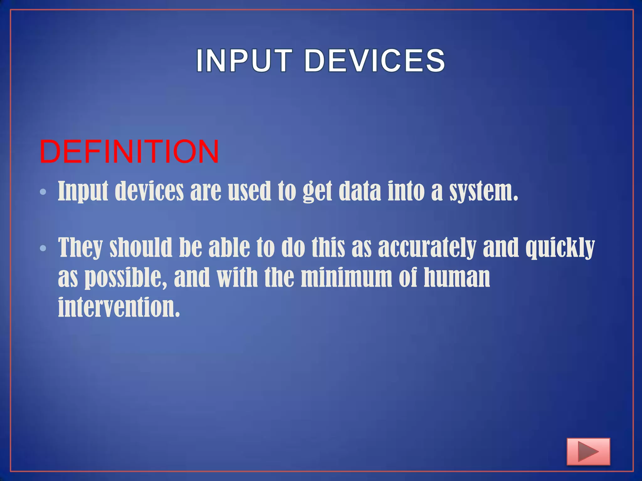 Input devices allow data to be entered into a computer system and include keyboards, pointing devices, readers, and digital imaging devices. Keyboards are the most common input device for entering text data. Pointing devices like mice, trackballs, and touchscreens translate user movements and selections into cursor movements on screen. Readers such as magnetic strip readers, barcode scanners, and optical character recognition scanners convert text or encoded data into digital form. Digital imaging devices like webcams, scanners, and digital cameras convert images, video, and sound into digital signals that computers can process and store.
