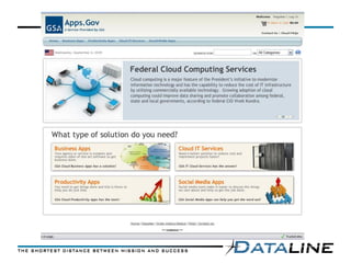 The document discusses government cloud computing initiatives in several countries and organizations. It outlines the US Federal government's plans to transition more IT services and data centers to cloud computing models in order to reduce costs. This includes initial pilots starting in 2009 and a goal of major agency capabilities being migrated to cloud platforms by 2012. Barriers to adoption like security, interoperability and governance are also covered. The economic benefits of transitioning to cloud computing are estimated to be savings of 5.7 to 15.4 times initial investments over a 10 year period.