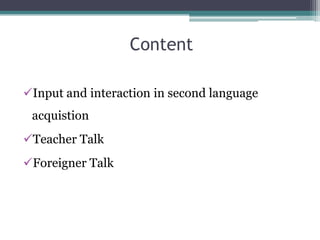 This document discusses input, interaction, teacher talk, and foreigner talk in second language acquisition. It summarizes theories on the importance of comprehensible input and interaction for language learning. Teacher talk features modifications to make input more understandable to students, such as shorter sentences and repetition. Foreigner talk also simplifies language when speaking to non-native speakers. Both teacher talk and foreigner talk aim to facilitate communication through modified speech.