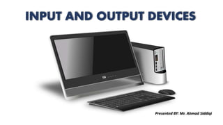 Input and output devices allow users to interact with computers. Input devices, like keyboards and mice, allow users to enter data. Keyboards contain standard keys and come in wired or wireless varieties. Mice control on-screen pointers and come in digital, analog, or mechanical forms. Scanners capture images and microphones input audio. Output devices, such as monitors, printers, and speakers convey information. Monitors come in LCD, LED, or CRT varieties. Printers include dot matrix, inkjet, laser, line, and thermal printers.