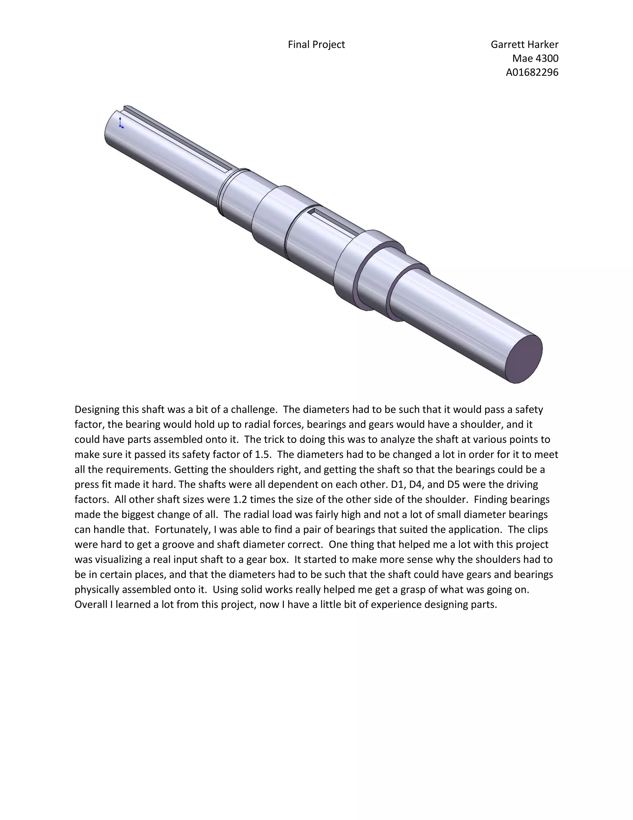 The document describes the challenges of designing a shaft to meet several requirements. The shaft diameters had to pass a safety factor test, support radial forces on bearings, and allow bearings and gears to mount onto the shaft. Analyzing the shaft at different points ensured it met the 1.5 safety factor. Diameters and shoulders were adjusted to satisfy all criteria. Visualizing a real input shaft helped understand design constraints. Solidworks modeling aided comprehension. The project provided shaft design experience.